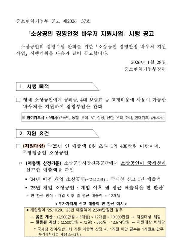 지원 대상: 2025년 기준 연 매출액 1억 4000만 원 미만이며 현재 영업 중인 소상공인.